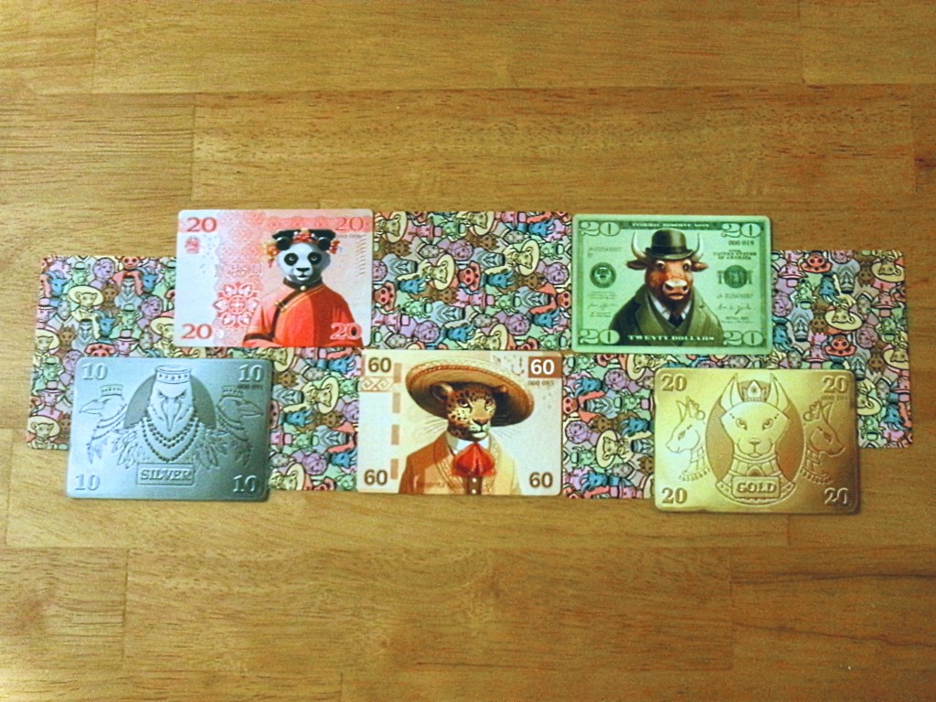 Though, to make it more interesting… Scoring is a bit unique. If you have $200 or more of a specific currency, you score the face value of that currency type. If you have more than $100, but less than $200 in a currency… Then, you subtract $100 from your score. But you also get a bonus $100 for each set of 3 you have. Each currency has three $20s, three $30s, and one each of $40, $50, and $60. Totalling 9 cards for each currency (with 7 different currencies in the game in total).